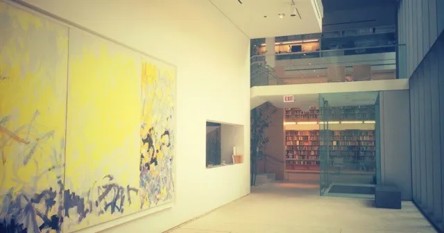 From 10am to 2pm one Saturday each month, The Poetry Foundation library located in downtown Chicago opens and is welcome to the public. Open hours Monday through Friday are 11am to 4pm; the library home to over thirty-thousand collected poetry and children’s’ books. From an initiating pilgrimage to the Poetry Foundation Saturday, February 16th, 2013, here are some photos of the entryway showing the library, in part.  The painting in the lobby was made by Joan Mitchell, whose poems are featured by Poetry magazine, in February.  In the library, there is quaint display of artifacts from her life, such as typewritten letters and other keepsakes.