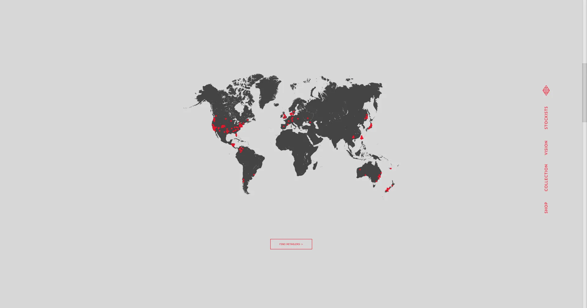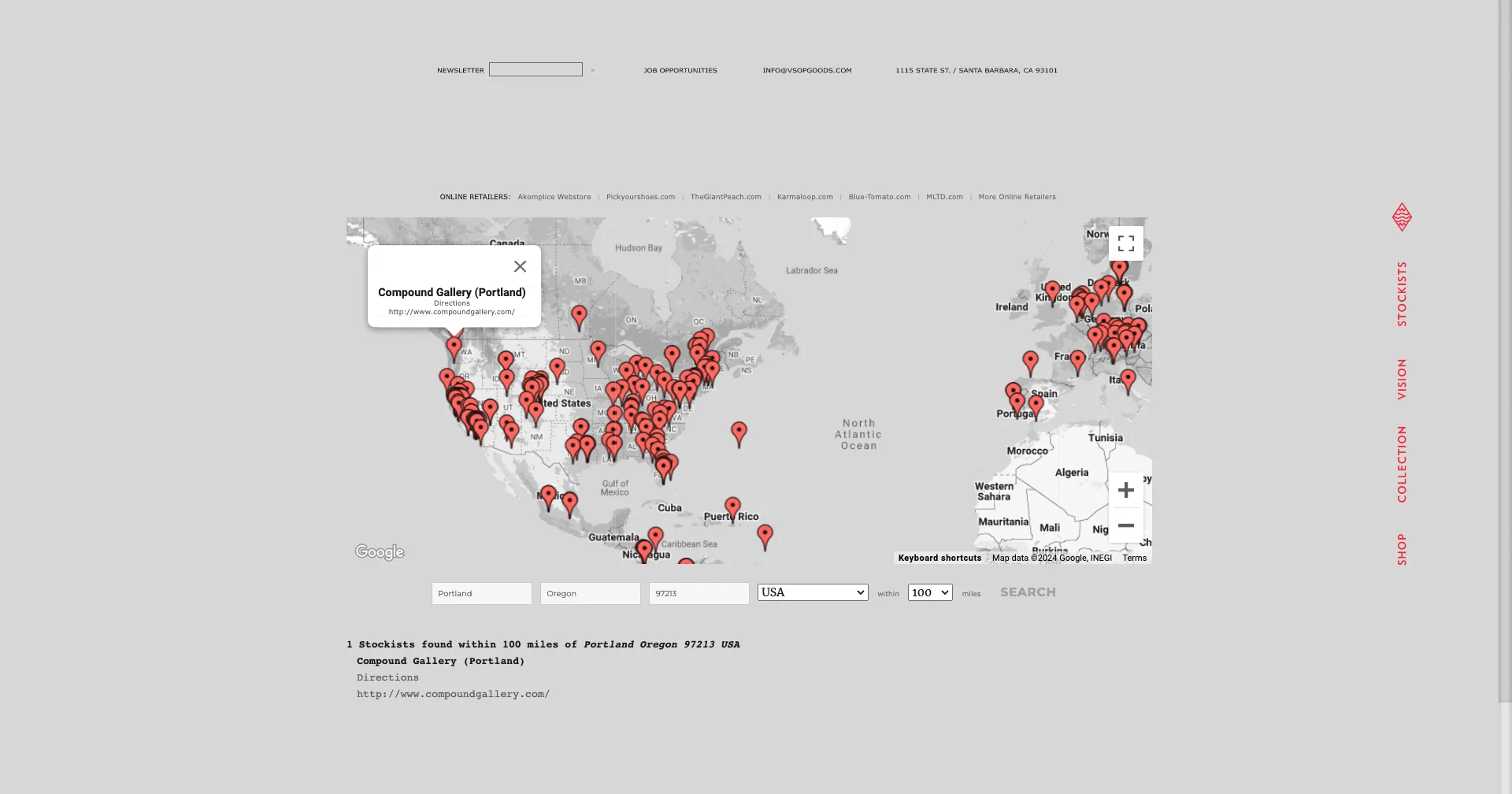 Maps API Javascript application pinning boutiques to the map, allowing for search parameters, custom map styling and more. Visit the stockists page and try out the map search component to find a retail location near you.